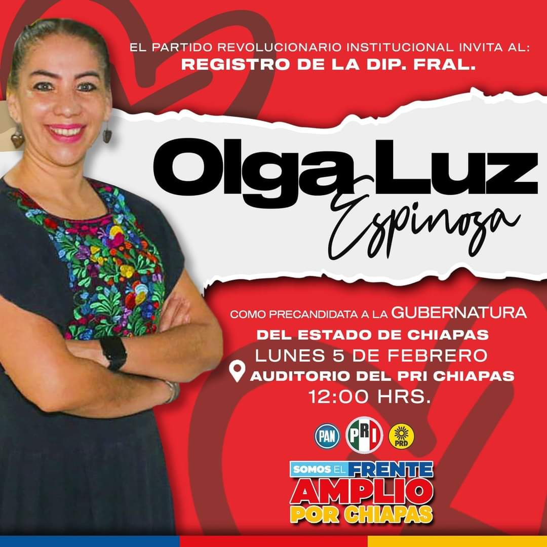 Hace unos días, Olga Luz Espinosa publicó un video en sus redes sociales, en el que que informó de su registro como «precandidata a la Gubernatura de Chiapas por mi partido mi sol azteca, el PRD. A quien le estoy agradecida por el apoyo y la confianza.»
