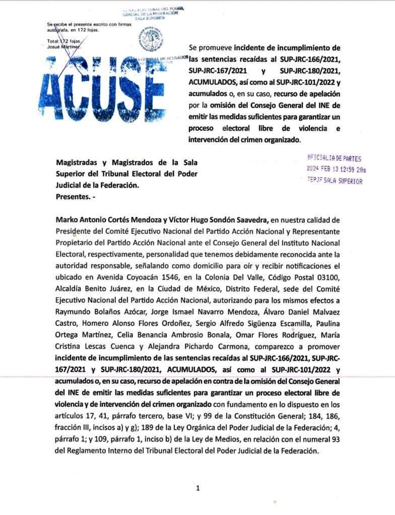 Chiapas Observa/Staff.- El Partido Acción Nacional (PAN) presentó un recurso ante el Tribunal Electoral del Poder Judicial de la Federación (TEPJF) contra el Consejo General del Instituto Nacional Electoral (INE), que “ha sido omiso” en la emisión de medidas suficientes para garantizar un proceso electoral libre de violencia e intervención del crimen organizado.