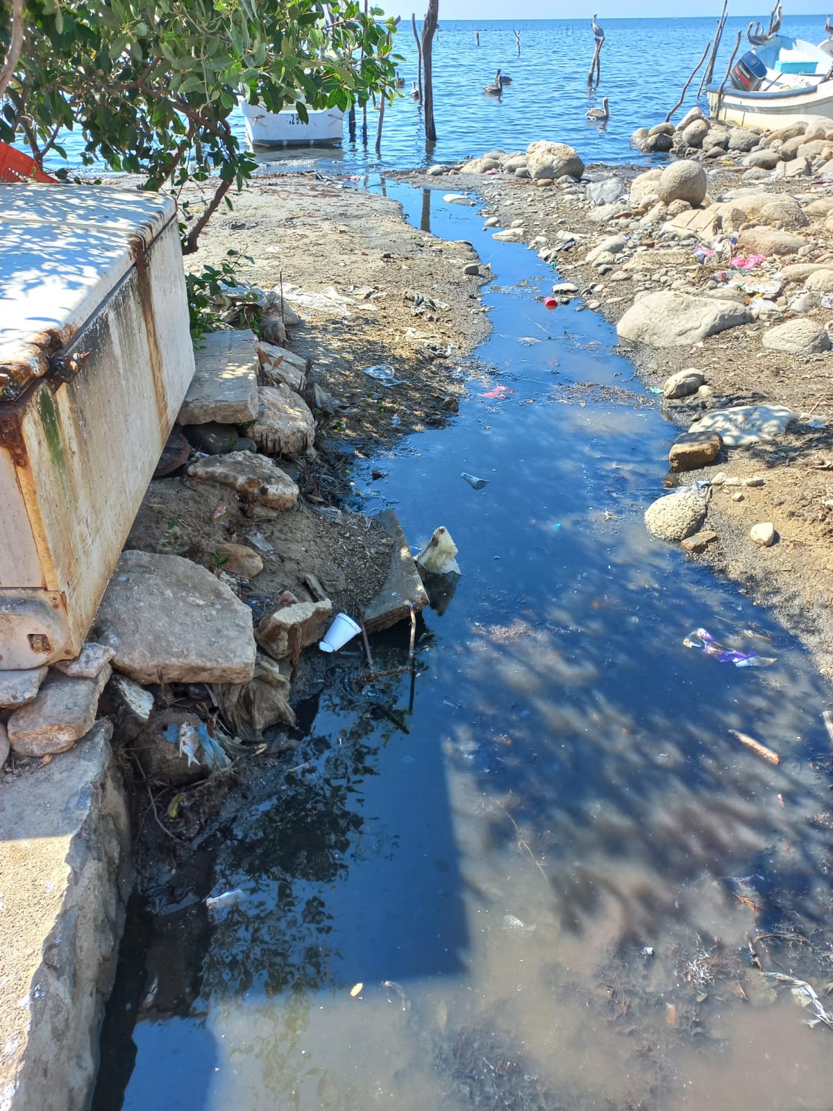 A simple vista, la ausencia de un sistema de drenaje público y tratamiento de aguas residuales es evidente. Por los patios, las calles e incluso dentro de algunas casas corren surcos de aguas negras que desembocan directamente en la enorme laguna conocida como el Mar Muerto, separada del océano solo por la Barra de Tonalá.