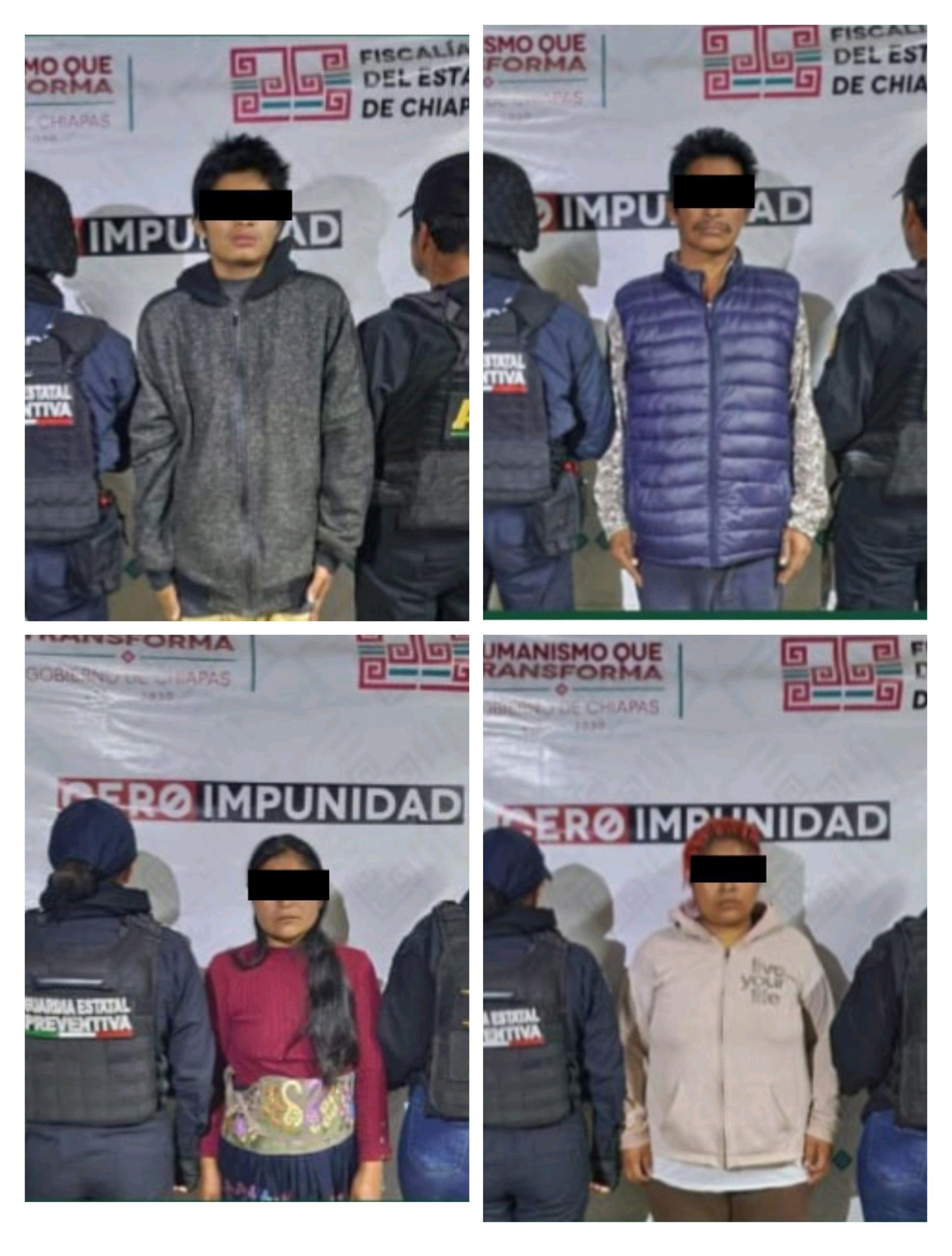 Chiapas Observa/Staff.- La Fiscalía General del Estado y la Secretaría de Seguridad del Pueblo cumplimentaron cuatro órdenes de aprehensión en contra de Lucia “N”, María “N”, Bartolo “N” y Miguel “N”, como presuntos responsables del delito de homicidio calificado, cometido en agravio de quien en vida respondiera al nombre de Agustín “N”, por hechos ocurridos en la localidad Los Pinos, del municipio de Tenejapa, el pasado 23 de agosto de 2025.