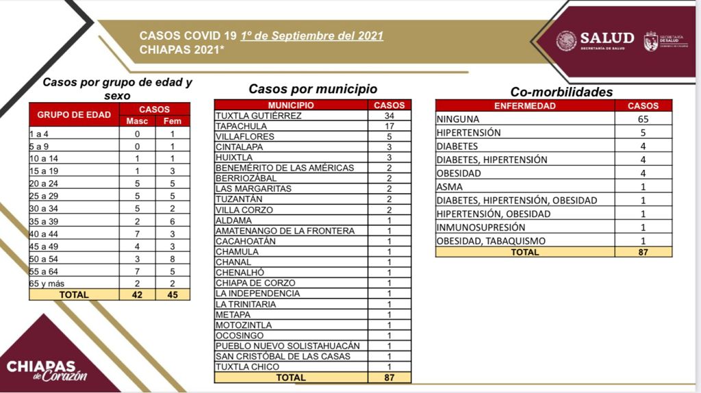 Chiapas Observa/Staff.- 01 de septiembre de 2021.- La Secretaría de Salud de Chiapas da a conocer que se confirmaron 87 casos nuevos de COVID-19 en las últimas horas; incidencia que se concentró en 25 municipios de la entidad.